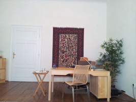 Zentrale Lage, Altbau, Parterre, Gesamtfläche 52 m²: Warteraum, hoher großer Praxisraum (30 m²), kleine Küche und WC für eigenen Gebrauch, extra Patient:innen-WC am Gang.